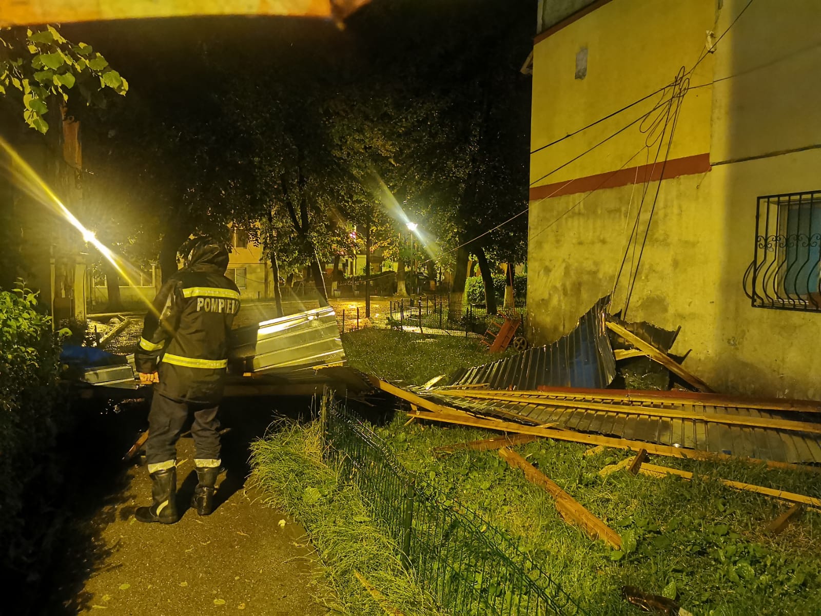 Pompierii au fost chemați să intervină și după ce tabla de pe un bloc a fost smulsă de viitură, pe strada Ion Elefterescu.