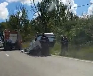 VIDEO Accident la ieșire din Săveni, spre Botoșani! O mașină a ajuns cu roțile în sus